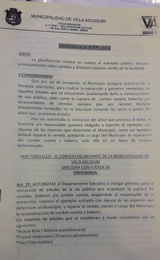 Ordenanza N° 1159/2018, sobre arbolado urbano
