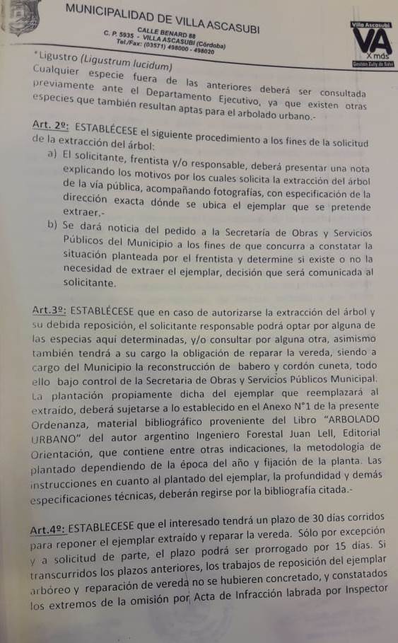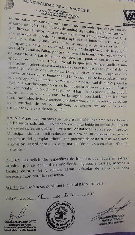 En ese sentido, Resiale precisó detalles sobre la Ordenanza Nº 1159/2018, sobre arbolado urbano. Hay importantes multas para quienes no cumplan, que podrían llegar a 20 mil pesos.